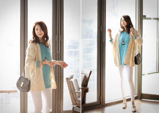 màu xanh. Cách mix áo len xanh trong với áo cardigan màu nhạt và quần skinny