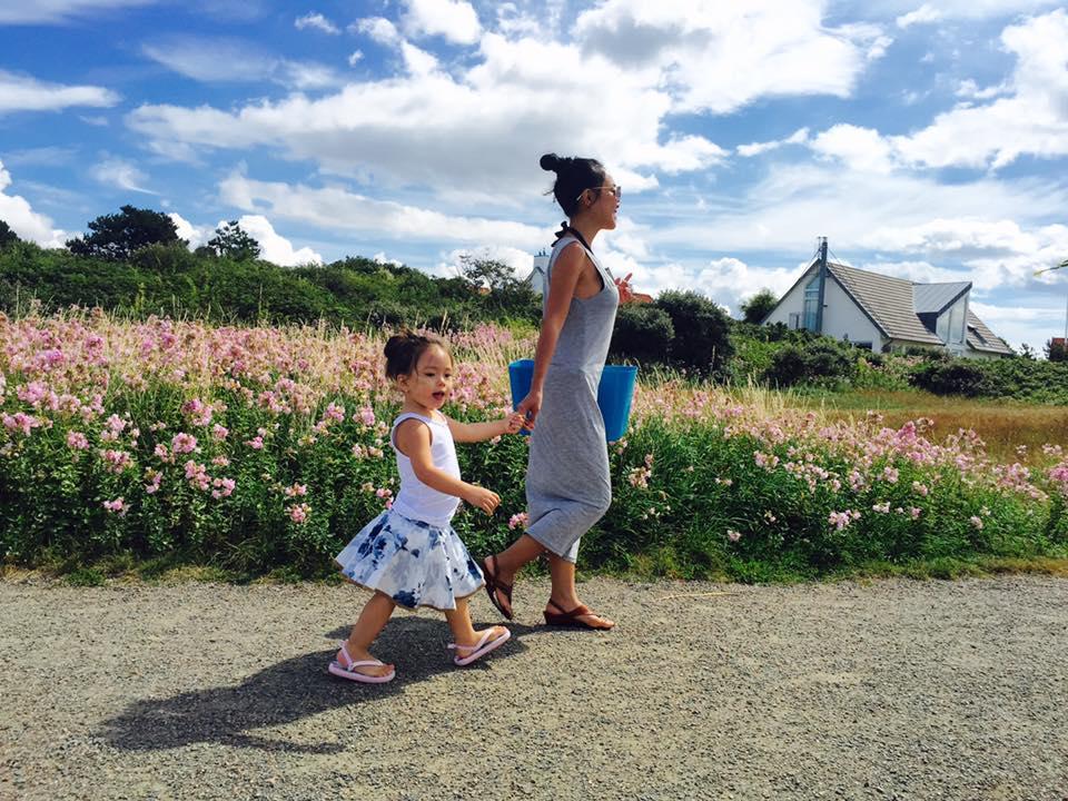 Mẹ con Đoan Trang sải bước ngắm vườn hoa quanh nhà ở quê chồng Thụy Điển.