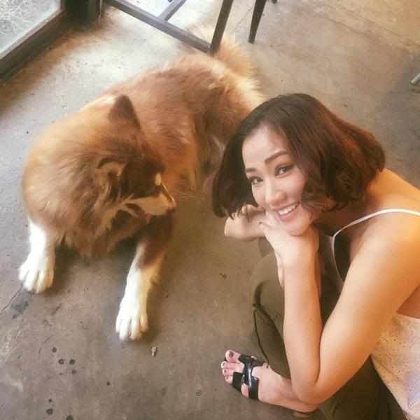 Maya đùa nghịch bên chú chó nhỏ. Cô chia sẻ: "Ăn cơm sớm, quay sớm, về sớm với em. Em trong hình ngoan lắm, muốn cưng lắm".