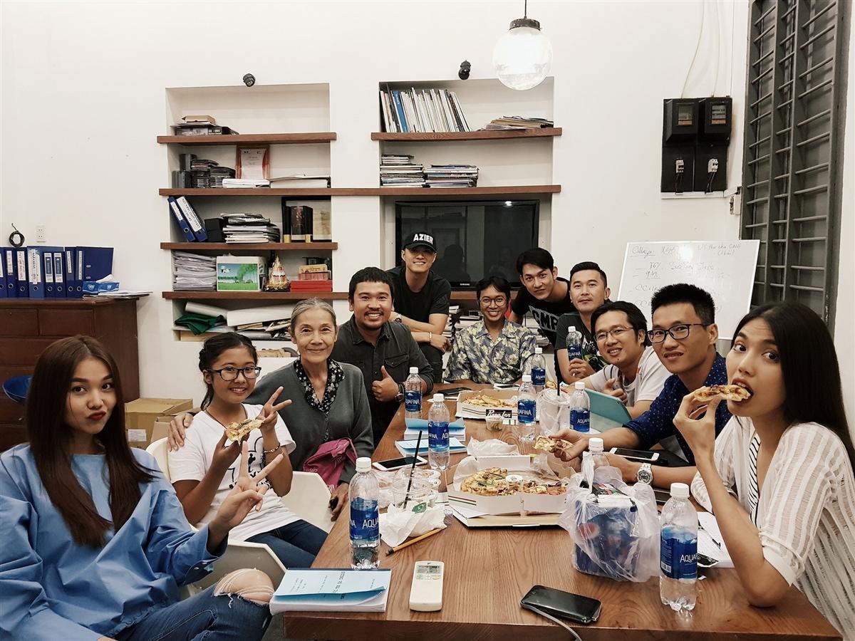 Thanh Hằng bật mí hậu trường phim: "Ekip phim 'Mẹ chồng' đang tập thoại với nhau.. ăn vội cho kịp tiến độ.. cả nhà đoán xem ai là con dâu của mình này. Chồng thì chưa có chứ phim này mình có 2 con dâu đấy"