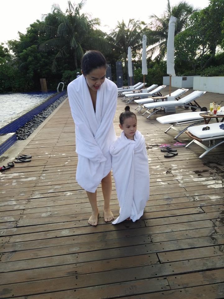 Phạm Quỳnh Anh cùng con gái đi bơi: Lúc nào được mặc gì dài thướt tha chấm đất