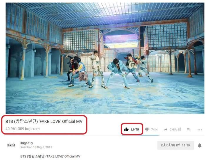Mới đây, con số thống kê cuối cùng cho thấy MV ca khúc Fake Love đã cán mốc 40,9 triệu views trên Youtube sau 24 giờ phát hành.