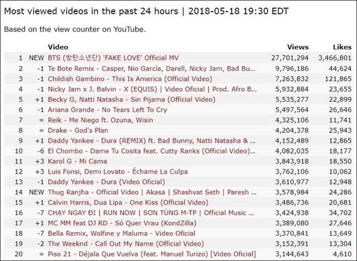 Thành tích quá ấn tượng này đưa BTS trở thành nghệ sĩ Kpop sở hữu MV có lượt xem cao nhất trong 24 giờ lên sóng (trước đó là Gentleman với 38,4 triệu view). Đồng thời, Fake Love cũng là music video có lượt xem cao thứ hai trên thế giới (sau Taylor Swift với MV Look What You Made Me Do đạt 43.2M) trong ngày đầu “trình làng”.