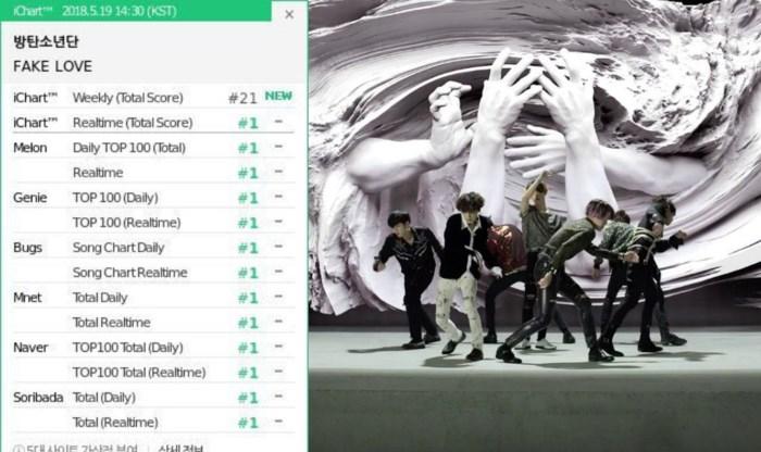 Ở “sàn đấu” trong nước, BTS chỉ mất 2 tiếng để quét sạch toàn bộ 6 bảng xếp hạng lớn nhỏ. Đặc biệt, Fake Love là ca khúc đầu tiên của BTS giành được chứng nhận CAK – Certified All Kill.