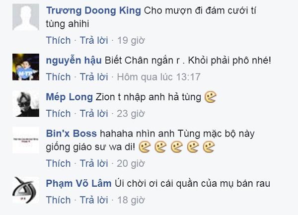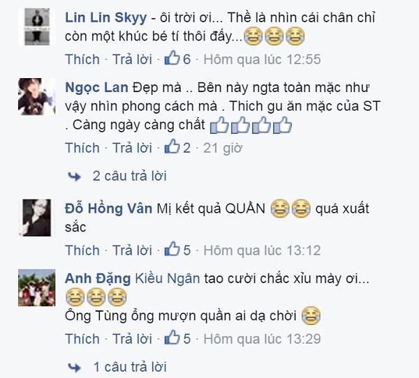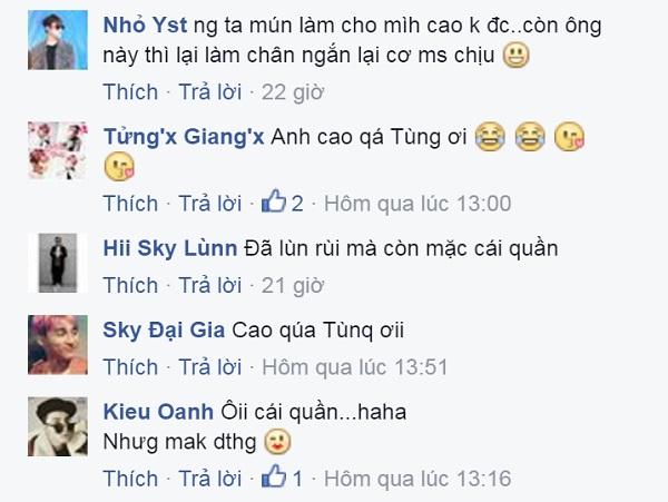 "Soi" bộ dạng mới của thần tượng, các fan Sơn Tùng đã không thể nhịn được cười. Theo ý kiến của số đông, bộ đồ này quá rộng so với cơ thể của Sơn Tùng. Thêm vào đó, chiếc quần culottes cũng quá rộng, khiến cho đôi chân vốn đã... ngắn nay lại càng ngắn hơn. Chính vì thế, thay vì khen thần tượng "soái ca", "cá tính"... như mọi khi, hàng loạt các ý kiến bình luận lần này chỉ nhắm vào... chiếc quần.