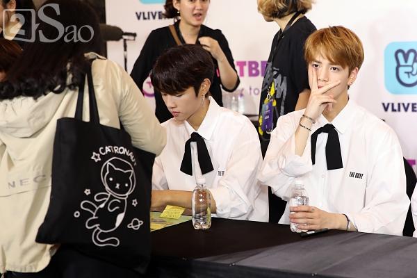 Mặc dù tập trung ký tặng khán giả nhưng những thành viên của The Boyz cũng không quên tương tác với những fan đang chờ phía dưới.