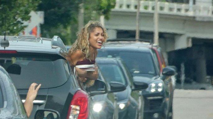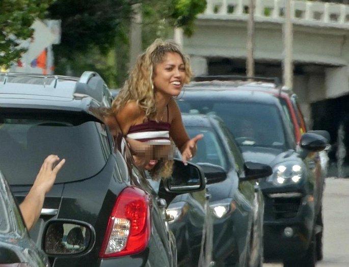 Cô gái bất chấp dòng người qua lại đông đúc, để lộ vòng 1 và gọi tên Beckham.