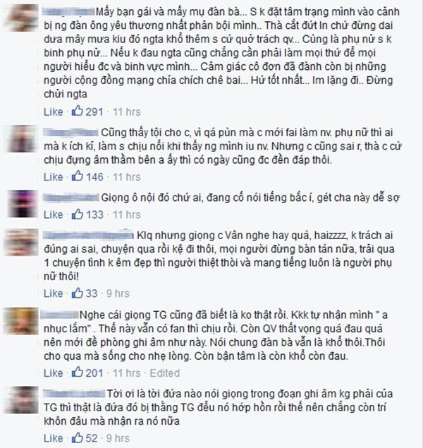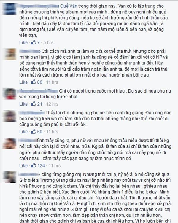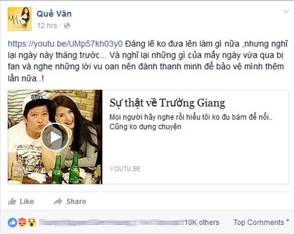 Hơn 10 nghìn lượt quan tâm theo dõi và đầy đủ các trạng thái ngạc nhiên và bực bội của người hâm mộ sau khi Quế Vân tung đoạn trò chuyện với Trường Giang lên facebook.