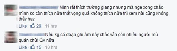 Khi đoạn clip trò chuyện kia được tung ra khiến nhiều khán giả vô cùng bất ngờ và hoang mang. Nhiều fans của Trường Giang đã không còn lí do để biện bạch cho thần tượng và chỉ trích Quế Vân 'đu bám' để nổi tiếng nữa. Thậm chí nhiều người còn tỏ thái độ thất vọng khi biết bộ mặt thật của Trường Giang: