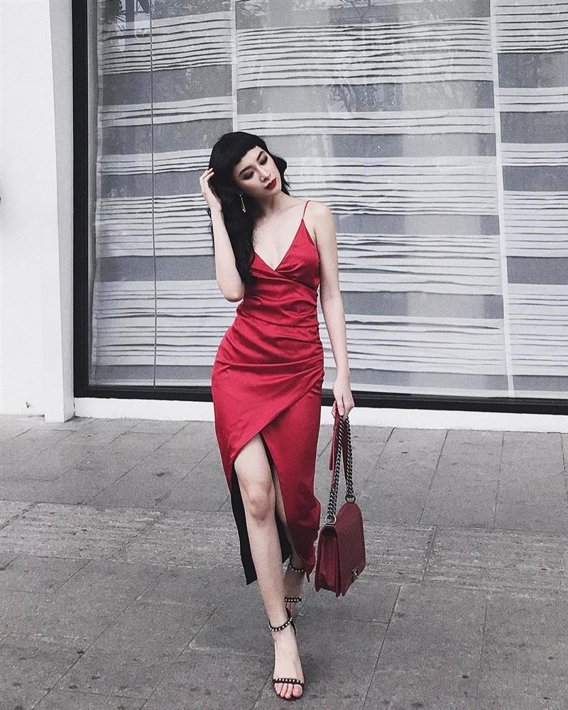 Angela Phương Trinh sexy xuống phố với váy hai dây tông đỏ