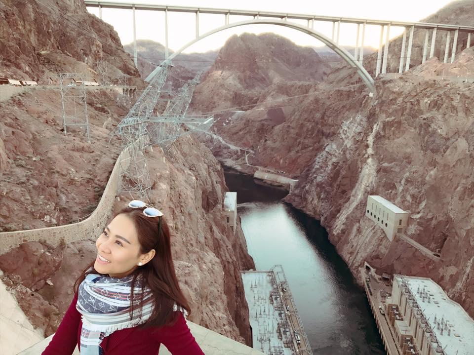 Thu Minh hào hứng check in nơi mình đến khoe với fans: Tạo dáng trước đập thuỷ điện vĩ đại Hoover Dam !