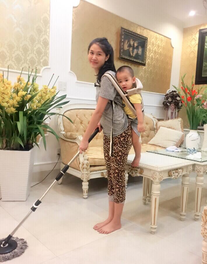 ở đời thường vợ Đăng Khôi ghi điểm bởi sự giản dị, vừa địu con vừa lau nhà.