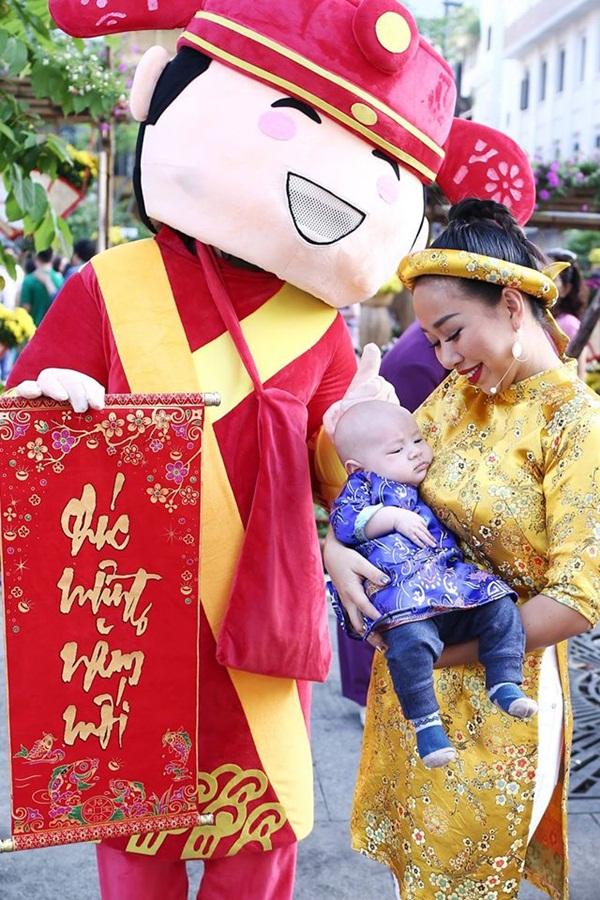Thảo Trang diện áo dài rực rỡ bế con trai đi du xuân.