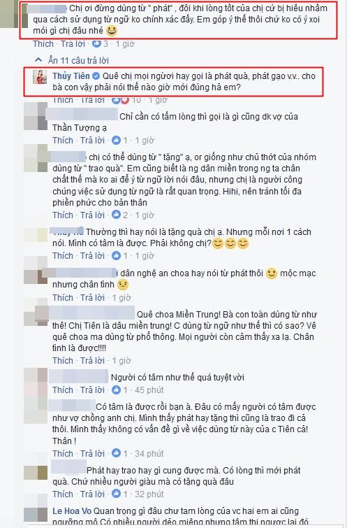 Đáp lại lời người hâm mộ, vợ Công Vinh cho biết: Quê chị mọi người hay gọi là phát quà, phát gạo v.v..