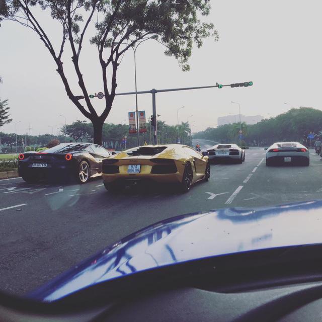 Đây cũng là lần đầu tiên siêu xe Ferrari 488 GTB màu xám chạy "thử sức" trên cao tốc Long Thành - Dầu Giây cùng với bộ đôi Lamborghini Aventador LP700-4 và Huracan LP610-4. Tuy nhiên, Cường "Đô La" không cầm lái "siêu ngựa" mà thay vào đó ngồi sau vô-lăng "siêu bò" Aventador độ "khủng" màu trắng.