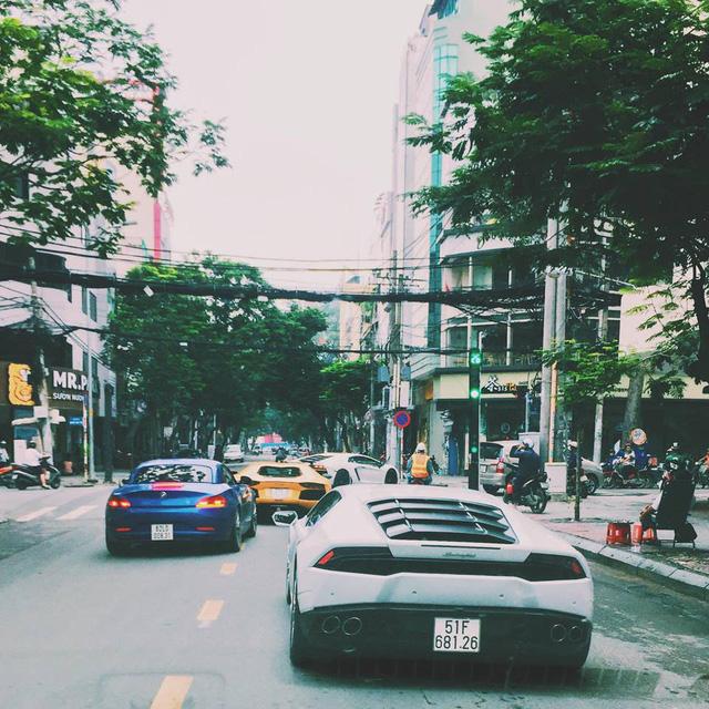 Dàn siêu xe nối đuôi nhau qua các tuyến phố tại Sài thành. Bộ đôi Lamborghini Aventador dẫn đầu, theo sau là Lamborghini Huracan LP610-4.