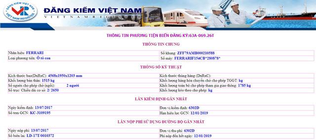 Thông tin đăng kiểm của chiếc Ferrari 488 GTB. Ảnh chụp từ màn hình.