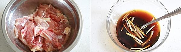 Gà mua về rửa sạch, để ráo rồi cắt miếng dài tầm 10-12cm. Sau đó cho hỗn hợp gia vị gồm xì dầu, rượu gạo, mật ong, nước mắm, nước và cọng hành trắng vào bát trộn đều.