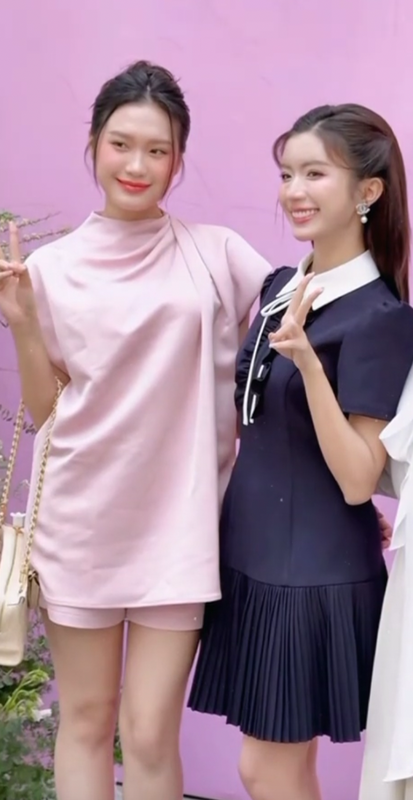 Người đẹp diện bộ đồ màu hồng pastel gồm áo cách điệu và quần ngắn để phô trọn đôi chân dài thẳng tắp như kiếm Nhật. Đây cũng chính là ưu điểm giúp Doãn Hải My lấn át mỹ nhân VFC Ngọc Huyền. Chẳng cần trang điểm cầu kì, bà xã Đoàn Văn Hậu vẫn ghi điểm nhờ nhan sắc rạng rỡ, tươi tắn.