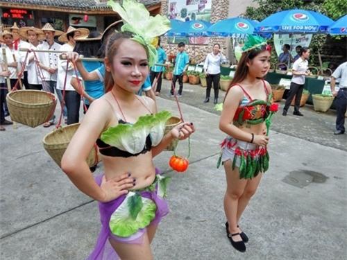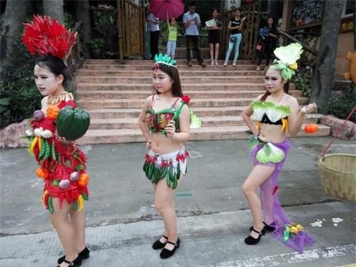 Những cô gái trẻ này không mặc quần áo hay váy vóc thông thường mà diện trang phục được làm từ những loại hoa quả, rau xanh vô cùng bắt mắt. Bộ trang phục khá hở hang, chỉ che được khoảng ngực và chiếc quần ngắn cũn của các cô gái.