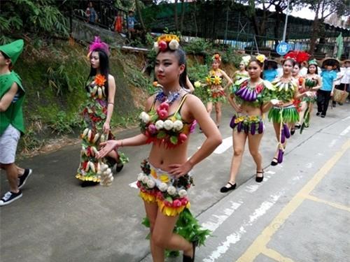 Vai trần, hở lưng hở bụng khoe chân dài trong trang phục rau củ quả chẳng giống ai, dàn mẫu trẻ gây náo loạn đường phố khi xuống đường đi theo nhịp chiêng trống, vừa múa vừa hát rất vui vẻ.