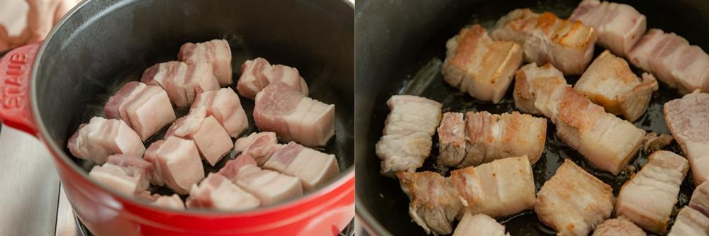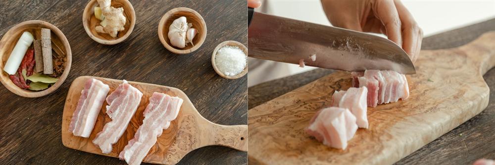 Thịt lợn rửa sạch, thấm khô sau đó thái khối vừa ăn.
