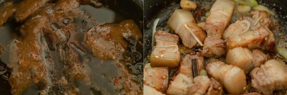Để một ít dầu ăn trong chảo, thêm đường vào đun ở lửa nhỏ cho đường tan chảy và chuyển màu cánh gián. Thêm thịt chiên vào đảo đều cho thịt phủ đều màu đường.