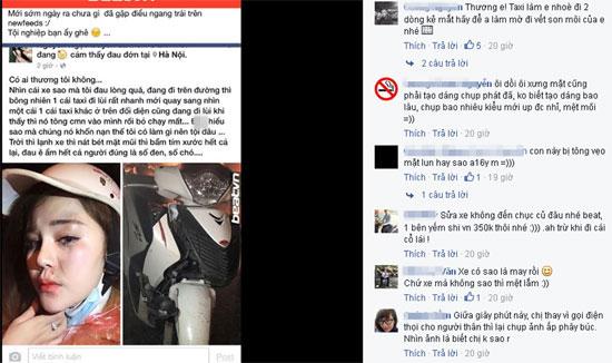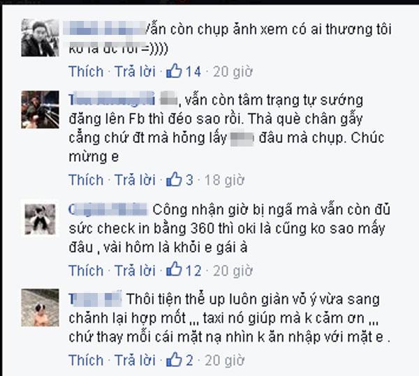 Nhiều người bình luận với giọng điệu mỉa mai: "Không hỏng cái mũi cái môi là cũng đỡ bao nhiêu tiền đi làm lại rồi đấy"; "Công nhận giờ bị ngã mà vẫn còn đủ sức check in bằng 360 thì cũng không sao đâu."; "Phải check in hẳn là Hà Nội để cho nỗi đau nó sang chảnh à?"