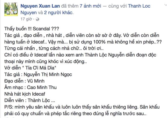 Là một người hâm mộ vở diễn, người mẫu Xuân Lan cũng lên tiếng thông qua trang cá nhân. “Thấy buồn, scandal? Tác giả, đạo diễn, nhà hát, diễn viên còn sờ sờ ở đây. Vở diễn còn diễn hàng tuần ở Idecaf, vậy mà bị sử dụng 100% không xin phép?”, cô viết.