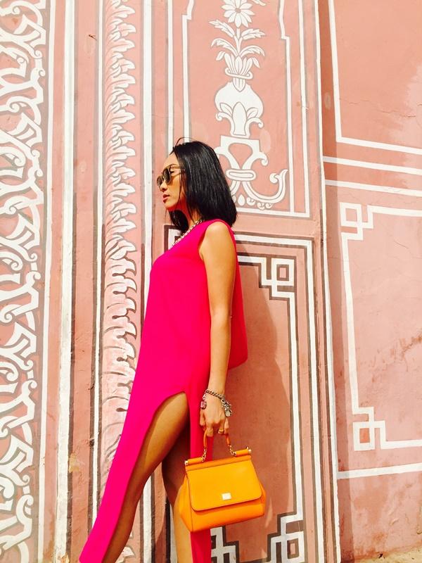 thành phố màu hồng. Chính về thế mà bộ váy Đoan Trang lựa chọn cũng
