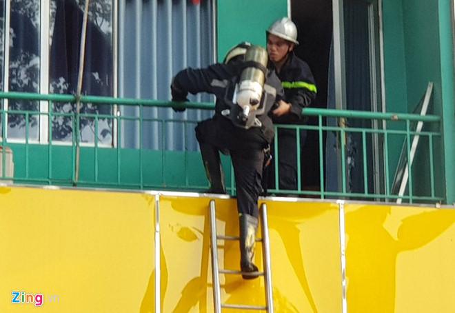 Tại hiện trường, 2 xe thang đưa lực lượng cứu hộ lên tầng 7 của khách sạn. Tại tầng 1, khói trắng phủ kín. Các chiến sĩ cứu hỏa khẩn trương trèo vào bên trong để đưa người mắc kẹt ra ngoài.