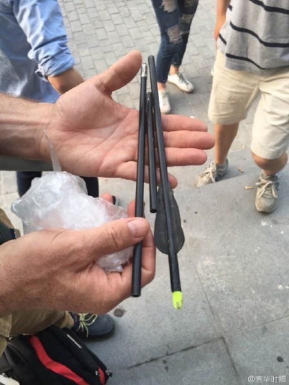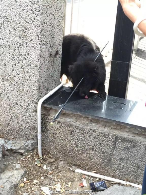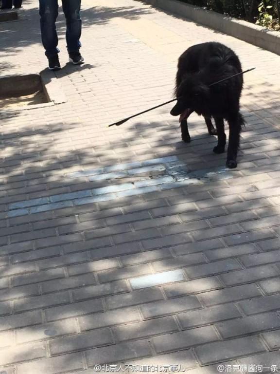 Chú chó cố gắng làm mũi tên ra khỏi đầu mình nhưng không được. Sau vài lần thất bại, nó được một số người tốt bụng đưa đến một bệnh viện thú y.