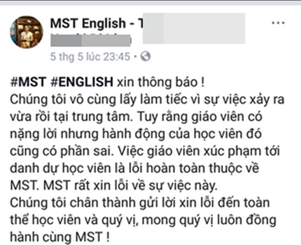 Sau khi video giáo viên xưng mày tao, chửi học viên là “lợn” đăng tải gây xôn xao dư luận, trang facebook MST- Tiếng Anh... được cho là của trung tâm tiếng Anh nơi xảy ra vụ việc, bất ngờ đăng tải dòng trạng thái trên đây.