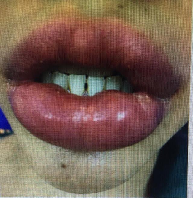 Ths.BS Vũ Thái Hà, Trưởng khoa Nghiên cứu và ứng dụng công nghệ tế bào gốc (BV Da liễu Trung ương) cho biết, tại thời điểm vào viện, bệnh nhân tổn thương sưng nề, căng bóng, sờ có khối chắc và vết dò ở môi trên và môi dưới, có phản ứng u hạt sau tiêm filler.