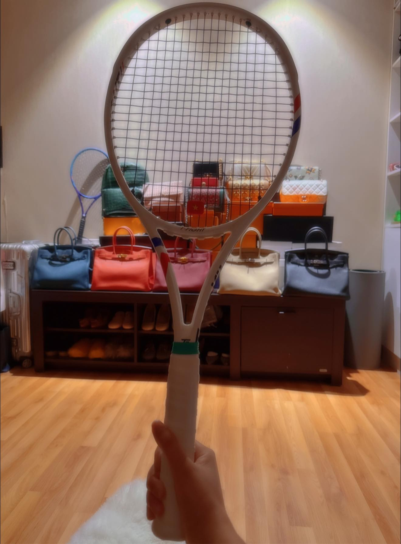 Đáng chú ý, dù cô khoe khéo chiếc vợt đầu tiên nhưng dân tình lại chỉ chú ý đến dàn "hậu cung" phía sau. Kho đồ hiệu bạc tỷ của Mai Phương Thúy được cô xếp trên một chiếc kệ đơn giản thay vì bảo quả trong tủ kính gắn đèn trang hoàng hoặc trưng hẳn phòng riêng như nhiều mỹ nhân khác.