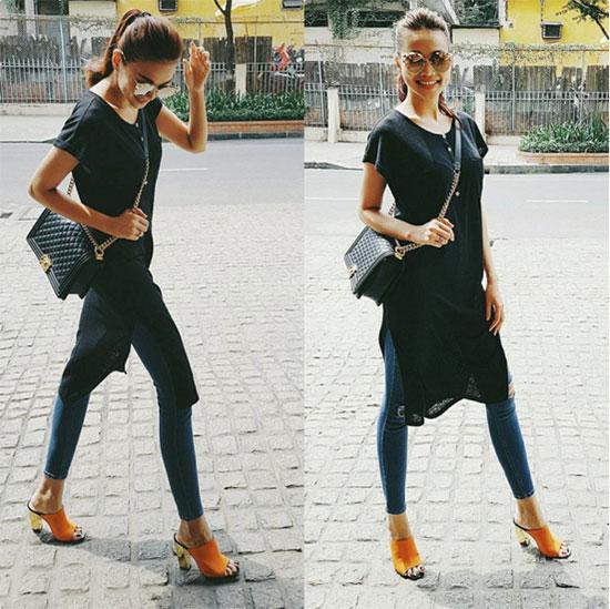 "Chân dài" Thanh Hằng mặc quần skinny, áo dáng dài khoe vóc dáng thanh mảnh. Cô mang theo túi xách hàng hiệu và đôi giày mules màu cam làm điểm nhấn ấn tượng cho toàn bộ set đồ.