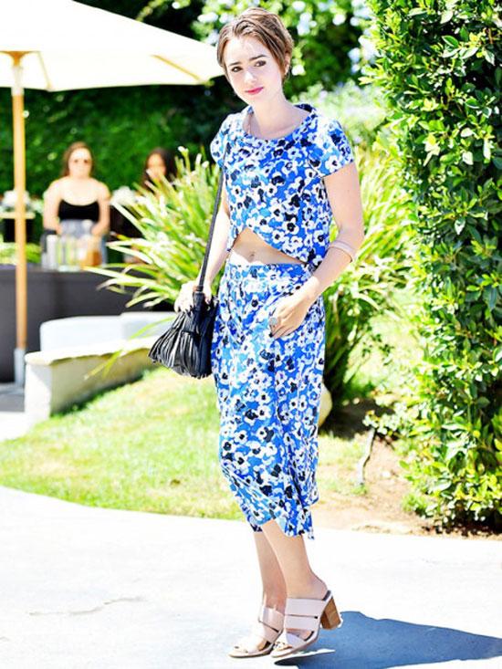 Lily Collins toát lên nét đẹp trẻ trung, tươi mới với tổng thể gồm "cả cây" họa tiết hoa xanh mát mắt và giày mules màu nude.