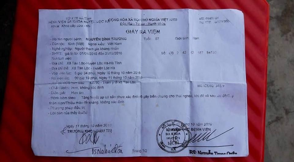 Chị Phan Thị Dung (con dâu ông Trương) kể: “Sáng 10.10.2016, cha tôi là Nguyễn Đình Trương (67 tuổi) thôn Tân Trung, xã Tân Lộc, huyện Lộc Hà, tỉnh (Hà Tĩnh) kêu tức ngực nên tôi chở ông xuống bệnh viện huyện Lộc Hà. Hai cha con định xuống khám rồi về, nhưng sau khi thăm khám các bác sĩ thấy huyết áp lên cao nên cho cha nhập viện”.