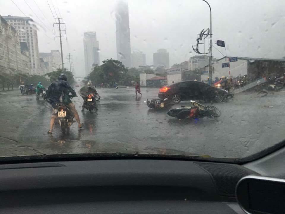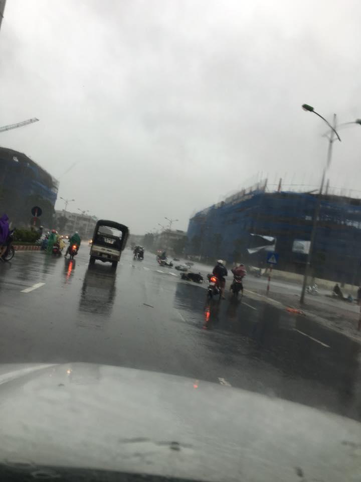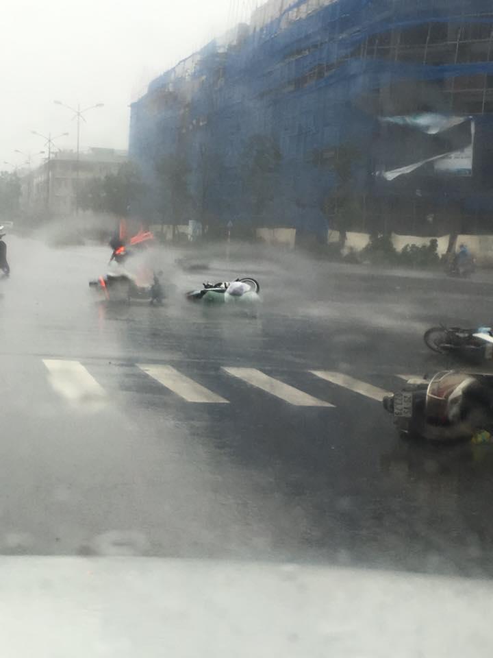 Nhiều người đang điều khiển xe máy bị ngã khi tham gia giao thông sáng nay vì gió bão quá mạnh.