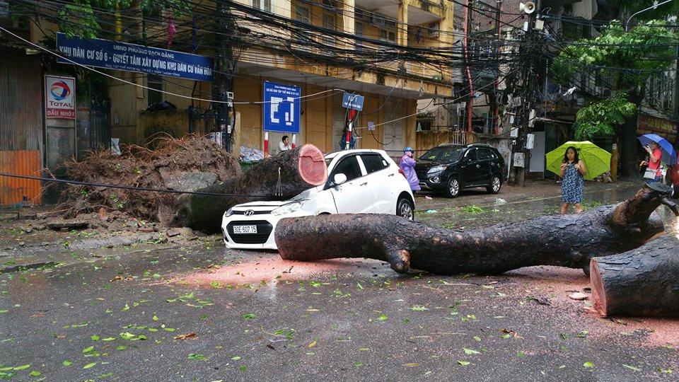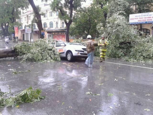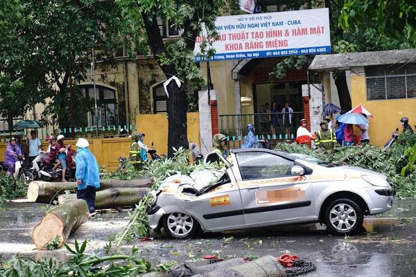 Cây xanh đổ đè ngang qua một ô tô trên phố Trần thái tông