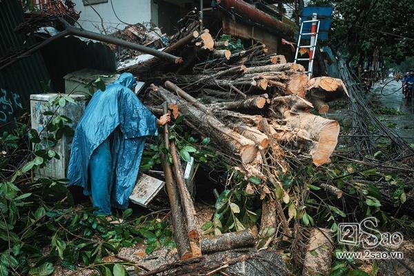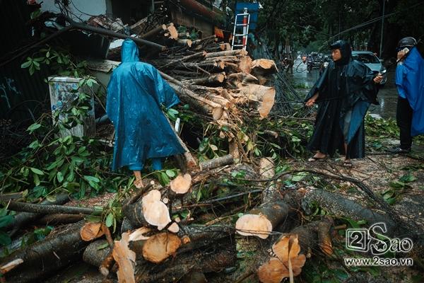 Một số người tranh thủ nhặt gỗ ở những cây bị đổ trên phố Đội Cấn - Liễu Giai.