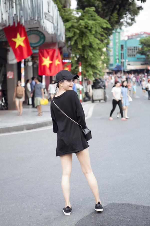 Cô bạn này mix đồ theo xu hướng áo giấu quần, mũ lưỡi trai cổ điển và toàn bộ cùng