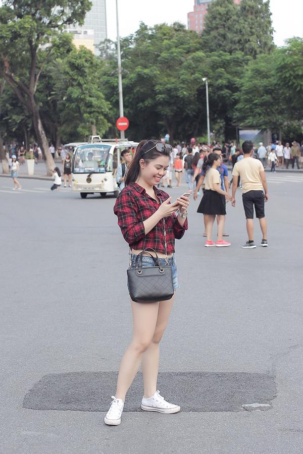 Bạn gái này thì lại chọn áo sơ mi kẻ caro đỏ, quần short và giày converse trắng. Màu sắc