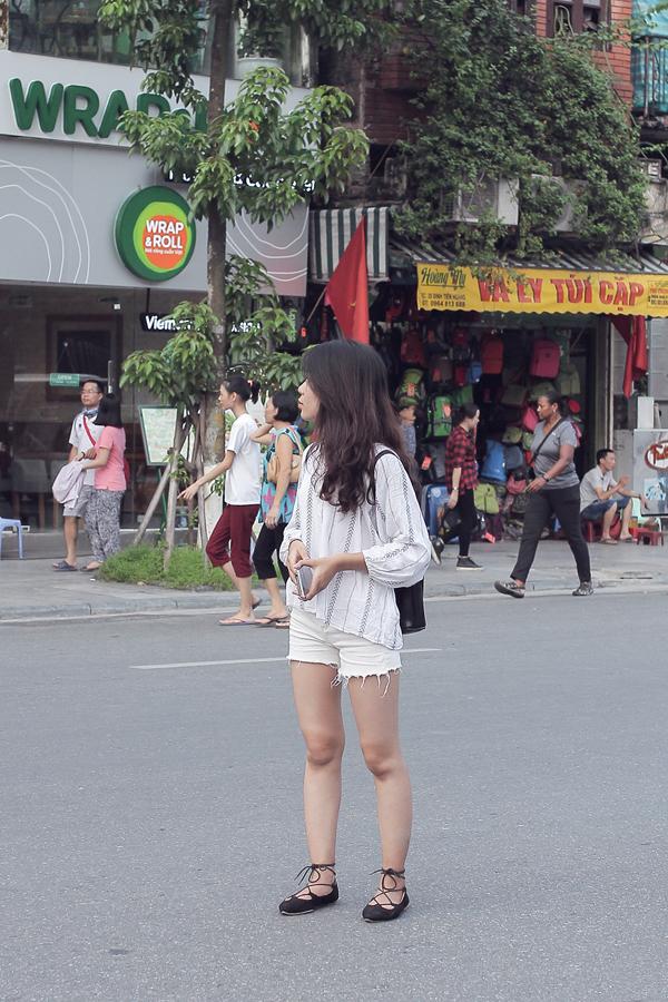 cùng short trắng đồng màu, cô bạn này kết hợp cùng ba lô và giày lace up đen,