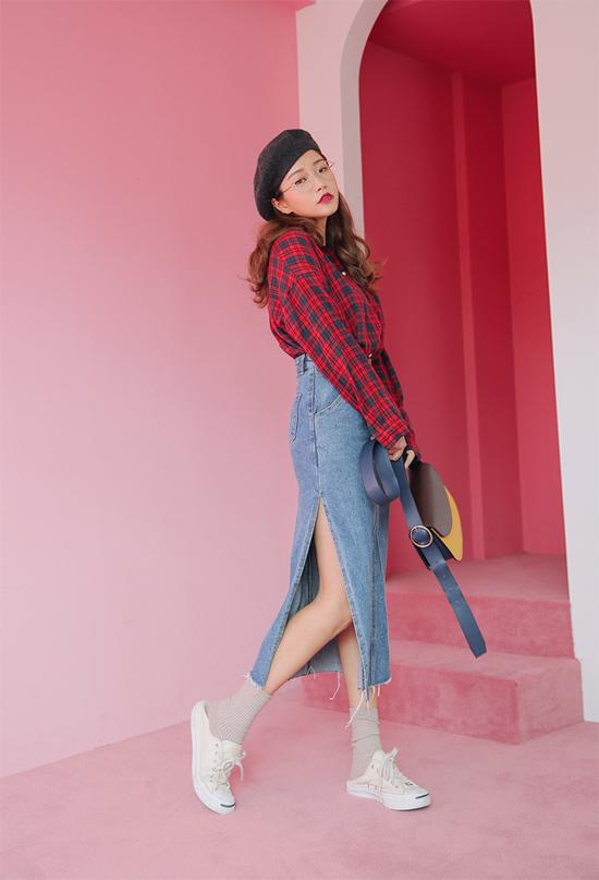 Những cô nàng muốn khoe đôi chân thon dài hay "kéo dài' đôi chân thì hãy nhanh tay lựa chọn combo gồm áo sơ mi kẻ sọc, chân váy mini chất liệu denim, áo cardigan màu đỏ. Thêm mái tóc búi cao, chắc chắn bạn sẽ không làm người đối diện phải thất vọng về phong cách.