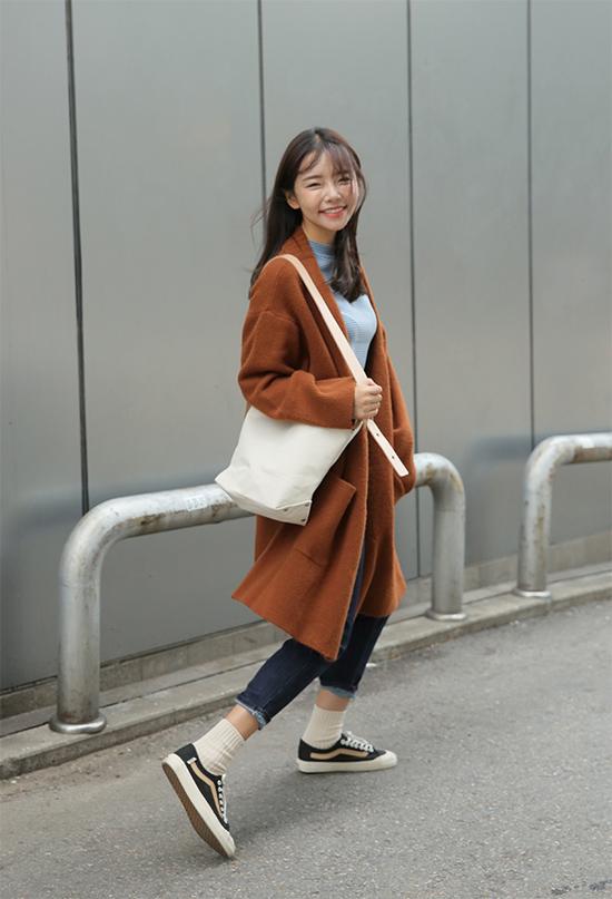 Nếu bạn nghĩ quần skinny, áo khoác caridgan đã có từ nhiều mùa nay nên dễ gây nhạt nhẽo thì quả thật sai lầm. Hãy nhìn quý cô Hàn này phối thì bạn sẽ thấy sự phóng khoáng, lãng mạn và tôn dáng hết cỡ.