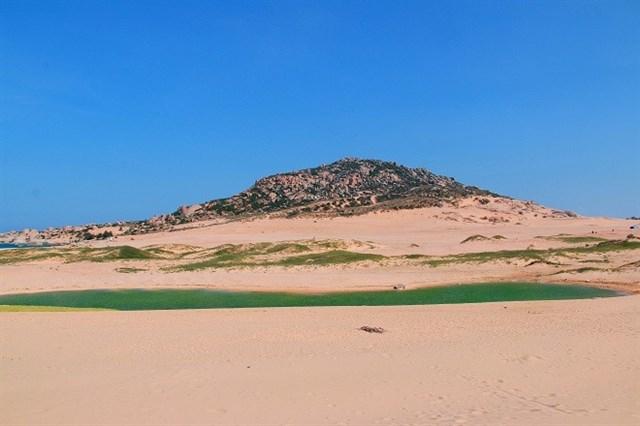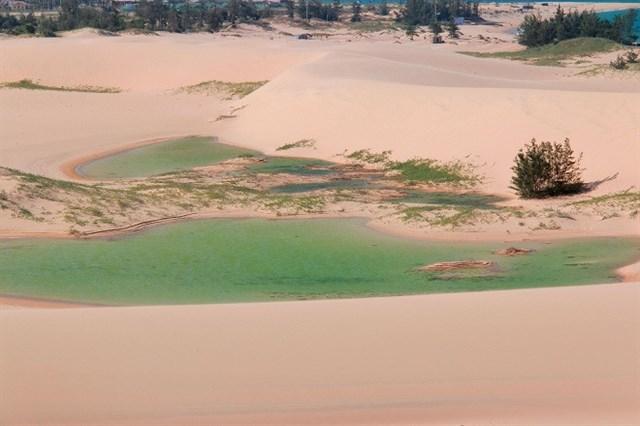 Điều khiến bạn không khỏi thích thú đó chính là những vũng nước tại đồi cát, lúc thì xanh nhạt, xanh lá, lúc thì lại màu xanh ngọc rất lạ. Hiện tượng này xảy ra chính là do những mạch nước ngầm, những con suối nhỏ ở trong núi chảy ra.