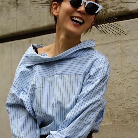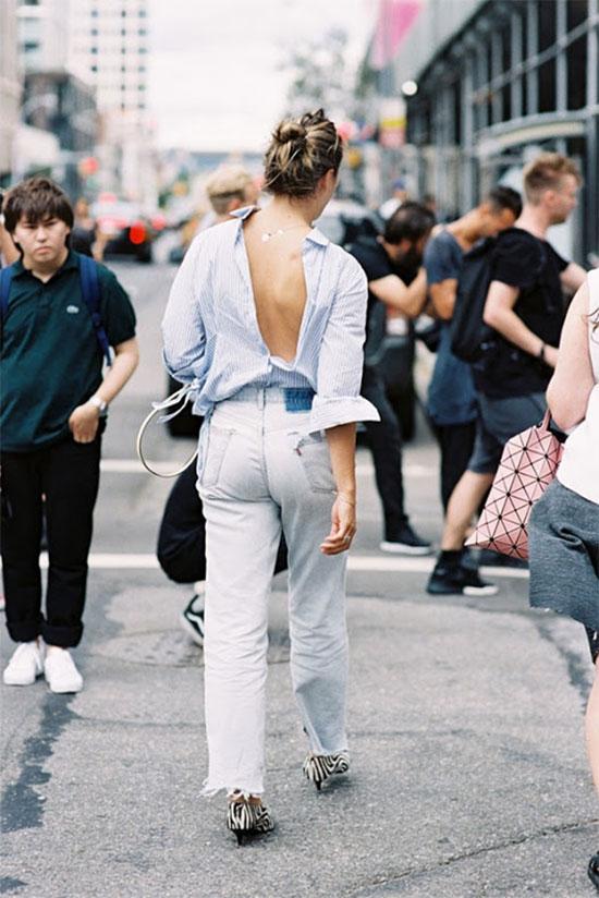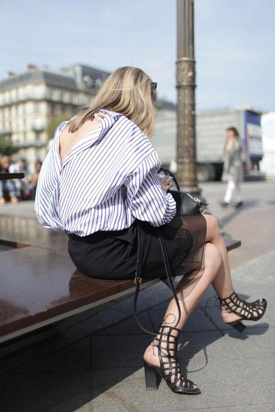 Cứ tưởng rằng áo sơ mi ngược rất hạn chế trong một số hoàn cảnh. Tuy nhiên, với cô nàng công sở, vẫn có thể mặc đẹp với style này. Chỉ có điều, bạn nên tinh tế không nên để phía sau lưng hở hang quá đà. Set đồ cuốn hút và lý tưởng cho bạn sẽ là một chiếc áo sơ mi ngược kẻ sọc, chân váy bút chì, xăng đan dây và xõa tóc điệu đà.