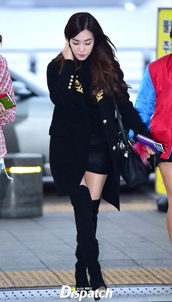 Tiffany mặc bộ đen lấp ló một phần chân gợi cảm. Cùng sáng nay, truyền
