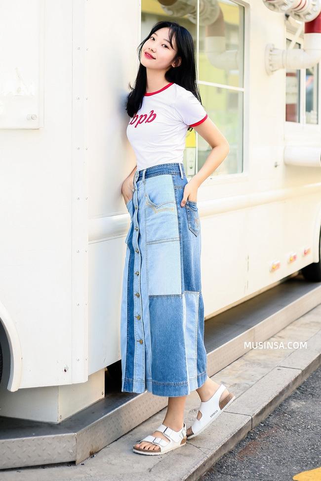 mà bỏ quên chân váy jean cạp cao. Không chỉ giúp chân trông dài tít tắp, item này